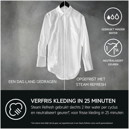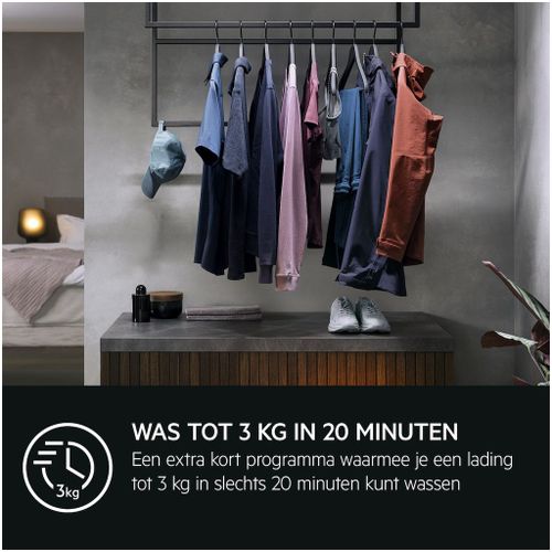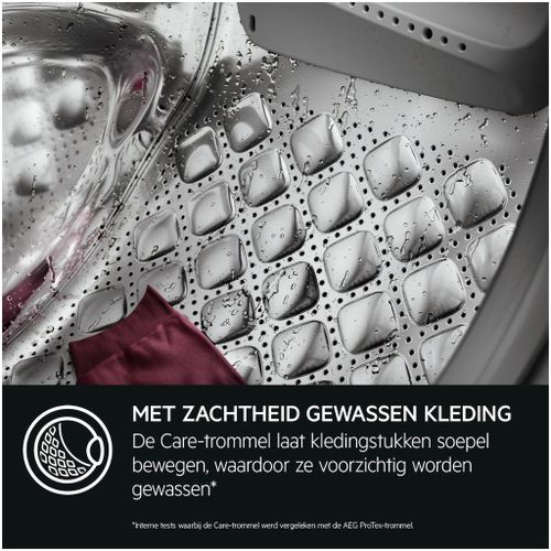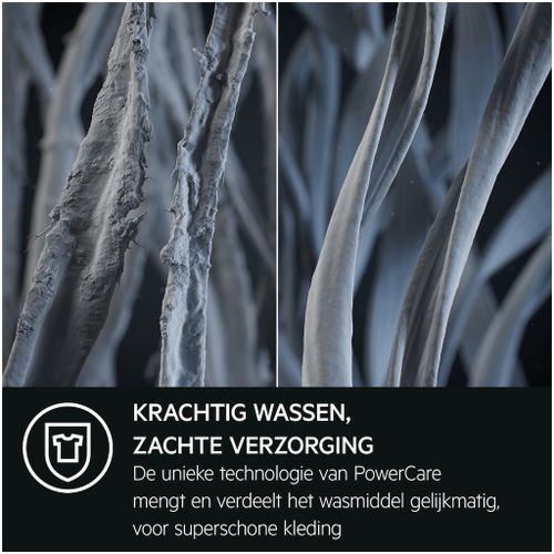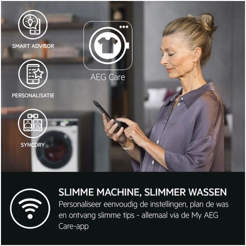 Superieur wassen - in minder dan 1 uur, op slechts 30°C. Zachte kledingbehandelingDe 8000 serie PowerCare wasmachine gebruikt een unieke techniek om wasmiddel snel vooraf te mengen, waarna het gelijkmatig over je kleren wordt gesproeid voor opmerkelijk schoon wasgoed. Het versterkt de kracht van het wasmiddel, zelfs op 30°C, voor uitstekende wasresultaten in minder dan een uur. PowerClean 59 min, volledig vlekvrij, zelfs op lagere temperaturen*PowerClean 59 min zorgt voor een bewezen volledige vlekverwijdering in minder dan een uur op 30°C.* Het zorgt ervoor dat het wasmiddel elke vezel bereikt — zodat een korte cyclus even doeltreffend is als een lange cyclus en vlekken volledig verwijderd worden. PowerClean 59 min, volledig vlekvrij, zelfs op lagere temperaturen**Externe test van PowerClean 59 min 30°C programma met een lading van 5 kg toont 100% verwijdering van 59 van de meest voorkomende huishoudvlekken. De UniversalDose lade activeert PODS® 60% sneller. Extra kracht bij snelle & koude wasbeurten*UniversalDose is een lade voor PODS® die waterstralen gebruikt om ze in de lade te verzachten, te doorprikken en volledig op te lossen, waardoor ze 60% sneller geactiveerd worden, vergeleken met PODS® in de trommel. Dit zorgt voor een betere vlekverwijdering bij koude & snelle wasbeurten van 1 uur.**Interne test met het katoenprogramma van 1 uur op 30°C, waarbij PODS® in de UniversalDose-lade vergeleken worden met PODS® in de trommel De volgende stap naar een meer persoonlijke waservaring met connectivityGebruik de AEG app om instellingen te personaliseren en slimme tips en suggesties te ontvangen. Personaliseer wasprogramma's en verstuur instructies naar je wasmachine om het aan je wensen en gewoontes aan te passen. Slim en makkelijk via je smartphone. Kledingstukken opgefrist.* Verminder kreuken met Steam RefreshSteam Refresh neutraliseert geurtjes* en vermindert kreuken in kledingstukken, ook in fijne was, in slechts 25 minuten. En als je van een extra boost frisheid houdt, voeg je gewoon onze aromatische stoomgeur toe. Dat geeft het die net gewassen frisheid.Kledingstukken opgefrist.* Verminder kreuken met stoom.*Uit externe tests blijkt dat de geur van sigarettenrook in een Steam Refresh-cyclus geneutraliseerd wordt. PreciseWash bespaart tot 40% tijd, water en energie* door elke lading te optimaliseren.PreciseWash past automatisch het energieverbruik en de instellingen aan naargelang het gewicht van de waslading. Je krijgt zo geoptimaliseerde wascycli die het energie-, tijd- en waterverbruik tot 40% verminderen bij het wassen van kleinere ladingen.**Interne test voor tijd, water- en energieverbruik van een 30°C katoencyclus, geoptimaliseerd met PreciseWash voor 1kg versus maximale lading.